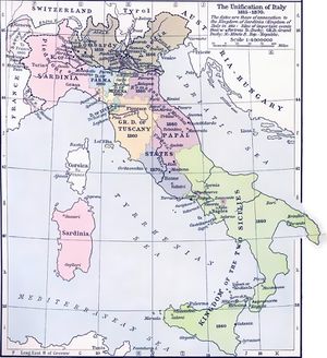 في عام 1848، ما هو الآن في العصر الحديث إيطاليا كان يتألف من الدوقية التالية، يقول، أو ممالك في شبه الجزيرة الايطالية الجنوبية وكانت جزيرة صقلية مملكة الصقليتين ، في شبه الجزيرة الإيطالية المركزية كانت الولايات البابوية ، في الشمال كان الدوقيتين ثلاثة من بارما ، توسكانا و مودينا ، في شمال غرب البلاد كان مملكة سردينيا ، التي تتألف من نيس ، جنوى ، سافوي ، البر الرئيسى بيدمونت ، وجزيرة سردينيا . [2] ويعتمد الاقتصاد اعتمادا كبيرا على الزراعة . وكانت المنتجات الزراعية الخاضعة لعدم استقرار الأسعار بسبب المنافسة الأجنبية، وبطء الزراعة الإيطالية يتناقض إلى أكثر كفاءة الأجانب. كانت هناك أعمال شغب بسبب الغذاء كل ذلك من خلال 1840-1847. تكاثرت الجماعات المتطرفة في روما. [ بحاجة لمصدر ]