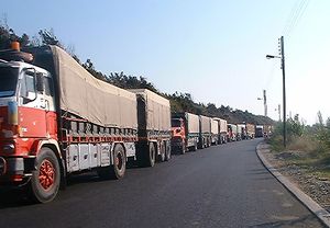 شاحنات تنتظر في طابور بعد إغلاق سوريا حدودها الشمالية مع لبنان في أعقاب انسحابها.[2]