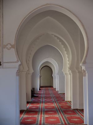 المحراب واسع وعريض، يقوم على أربعة أعمدة من اليشب، [حجر كريم مختلف الألوان] تعلوها تيجان أموية بديعة، وبه أربعة أعمدة أخرى منتصفة تحمل الإطار الفخم للقوس، عليها تيجان مثلها تحمل أطار العقد ولوحة المحراب، والإطار غاية في الفخامة.وعلى كل واحد من البابين القريبين - باب المنبر وباب الإمام - أربعة أعمدة أخرى بجانبيهما، فهذه اثنا عشر عمودا. وتسم التيجان الأموية الإثنا عشر هذا المجموع بميسم أندلسي. ومشكاة المحراب داخلة في عمق جدار القبلة نقشت عليه كتابة دارجة تمتد على قدر قامة الرجل. المنبر: كان المنبر عبارة عن قطعة أثاثية جليلة، وهو أقل مهابة وضخامة من منبر الكتبية. فهو بما فيه من البساطة، وزخارفه الزهرية، وطلاوة فسيفسائه مفخرة..