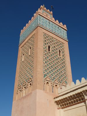 شيدت في الركن الشمالي الغربي من الجامع، مربعة القاعدة ضلعها 8.80 م، ملساء إلى حدود سقف الجامع، وما فوق ذلك مزخرف إلى القمة، حيث إفريز من الخزف المزخرف يسطع نورا،تحفه عصابتان أفقيتان. ولبست كلها بزخرف متشابك فاخر، على كل جهة ثلاثة عقود مفصصة، تقوم على أعمدة وتيجان مزخرفة، وتحيط بثلاث نوافذ مصطفة في خط واحد، وتتشابك امتدادات هذه العقود مع شرائط مثلها مفصصة تنشأ من صف ثان من سويريات زخرفية موضوعة فوق الأولى بين مداميك العقود، وينتهي تشابكها عند عصابة الزليج. يقول الوزان مسجد في غاية الجمال والعظمة، تعلوه صومعة متناهية الجمال، وفي أعلاه ركز عمود من حديد فيه ثلاث تفاحات من ذهب أكبرها السفلي، وأصغرها العليا، وقد أراد كثير من الملوك أن يزيلوا هذه التفاحات وصكها نقدا عندما اشتدت حاجياتهم إلى المال، لكنهم في كل مرة تحدث لهم حادثة غريبة تلزمهم بتركها، حتى أنهم تطيروا من مسها]. وفي سنة 981 هـ/1573 م وقع انفجار بجامع القصبة سببه كما جاء في أعلام التعارجي كان بقصبة مراكش جماعة من أسارى النصارى من لدن أيام أبي العباس الأعرج وأخيه أبي عبد الله الشيخ، فرأوا الحجم الغفير من أعيان المسلمين وأهل الدولة يحضرون كل جمعة للصلاة مع السلطان بجامع المنصور من القصبة المذكورة، فحدثتهم نفسهم بأن يصنعوا مكيدة يهلكون بها السلطان ومن معه، فحفروا في خفية تحت الجامع حفرة ملأوها بالبارود ووضعوا فيها فتيلا تسري فيه النار على مهل كي ينقلب الجامع بأهله وقت الصلاة، فنفطت المينا وانهدمت بها القبة الواسعة من الجامع المذكور، وانشق منارها شقا كبيرا لازال ماثلا إلى الآن] . وممن جدد الجامع السلطان سيدي محمد بن عبد الله، ثم السلطان مولاي عبد الرحمان.