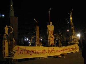 في أعقاب التصويت لصالح الحظر، خرجت المظاهرات ضد نتيجة الاستفتاء في مدن سويسرا الكبرى. الملصق تحت المئذنة المصنوعة من الورق المقوى تقول: "التكامل بدلاً من الإقصاء!"