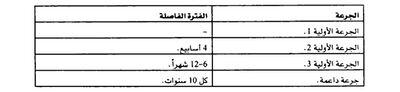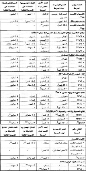ويظهر الجدول الأعمار التي يوصى بإعطاء اللقاح فيها، وأقل الفواصل الزمنية الممكنة بين جرعات اللقاح بالنسبة للقاحات الموجودة في برنامج التمنيع في الطفولة.