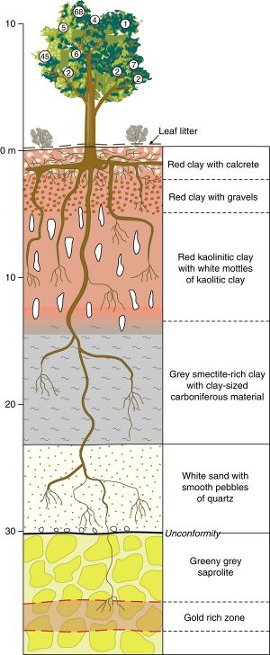 باحثو CSIRO يعتقدون أن الأشجار،التى تنتصب على رأس ودائع الذهب المدفونة في أعماق الأرض، تمتص الذهب في بحثها عن الرطوبة التي تقع في أوقات الجفاف. " قال الدكتور ميلفين لينتيرن، لم نكن نتوقع هذا على الإطلاق"، وهو كيميائي جيولوجيا الأبحاث في CSIRO ومؤلف الدراسة عن الذهب. "لرؤية الواقع على جزيئات الذهب في الأوراق كان لحظة اكتشاف لا بأس بها لنا." الدكتور لينتيرن قال الأشجار يبدو أنها تخبر العلماء ما يحدث تحت سطح الأرض. "قال: الأشجار بوجه خاص التى أجرينا عليها الأبحاث تبدو أنها تجلب الذهب عاليا من عمق 30 مترا بالتأكيد، وهي عبارة عن ما يعادل مبنى من 10 طوابق" . تستخدم مجموعة البحث CSIRO للكشف عن مايا للأشعة السينية للتصوير العنصرى في السنكروترون الاسترالية في ملبورن لتحليل جزيئات صغيرة للغاية بدقة عالية. الأجزاء من الذهب تمثل يقرب من خمس قطر شعرة الإنسان. أن الدكتور Lintern فال أنه حتى زراعة 500من الأشجار التى تنمو فوق ودائع الذهب تسفر فقط ما يكفي من الذهب لخاتم زفاف. الباحثين قالو أنهم قد وجدوا الذهب في أوراق الأشجار الأخرى،: مثل Acacia mulga . "وقال الدكتور Lintern وجدنا في الواقع الذهب ليس فقط في الأشجار ولكن في الشجيرات التى تنمو تحت الأشجار كذلك، لذلك (هو) لا يقتصر فقط على أي أشجار خاصة على الإطلاق ". |