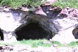 The Pleistocene glaciations almost entirely covered Scotland in ice, and Arran's highest peaks may have been nunataks at this time.[21] After the last retreat of the ice at the close of the Pleistocene epoch sea levels were up to 70 متر (230 ft) lower than at present and it is likely that circa 14,000 BP the island was connected to mainland Scotland.[29] Sea level changes and the isostatic rise of land makes charting post-glacial coastlines a complex task, but it is evident that the island is ringed by post glacial raised beaches.[30] King's Cave on the south west coast is an example of an emergent landform on such a raised beach. This cave, which is over 30.5 متر (100 ft) long and up to 15.3 متر (50 ft) high, lies well above the present day sea level.[31][32][33] There are tall sea cliffs to the north east including large rock slides under the heights of Torr Reamhar, Torr Meadhonach and at Scriden (An Scriodan) at the far north end of the island.[19][34][35]
