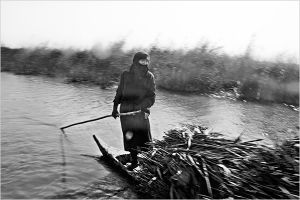 صياد في قارب صيد محلي في المياه الضحلة لنهر الفرات تحت جسر الهندية. |