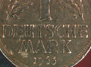 هذه العملة من المارك الألماني تبين blemishes and rim dents that would detract from its grade in appraisal.