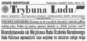 Under martial law in Poland, from December 1981 Dziennik was presented by officers of the Polish Armed Forces or newsreaders in military uniforms and broadcast 24-hours a day.[36][37] The running time has also been extended to 60 minutes. The program returned to its original form in 1983.[38] The audience viewed this move as an attempt to militarize the country under a military junta. As a result, several newsreaders had difficulty in finding employment after the fall of communism in 1989.[37]
