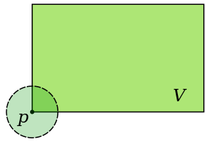A set that is a neighbourhood of each of its points is open since it can be expressed as the union of open sets containing each of its points. A rectangle, as illustrated in the figure, is not a neighbourhood of all its points; points on the edges or corners of the rectangle are not contained in any open set that is contained within the rectangle.