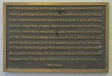 Bell Labs subsequently authorized a full research program in late 1938 with Stibitz at the helm. He led the development of the Complex Number Calculator (CNC), completed in November 1939 and put into operation in 1940. Employing electromagnetic relay binary circuits for its operations, rather than counting wheels or gears, the machine executed calculations on complex numbers.[7] In a demonstration at the meetings of the American Mathematical Society and Mathematical Association of America at Dartmouth College in September 1940, Stibitz used a modified teletype to send commands over telegraph lines to the CNC in New York .[8][9] This was the first real-time, remote use of a computing machine.[10]
