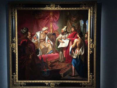 لوحة من جوليو كارليني لزيارة وفد جمهورية البندقية لمصر لعرض مشروع حفر قناة بين البحرين على السلطان الغوري ردا على اكتشاف ڤاسكو دا گاما لطريق رأس الرجاء الصالح. معرض قناة السويس بمعهد العالم العربي في باريس.