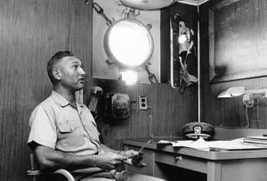 Commander W.L. McGonagle in his damaged cabin after the attack.