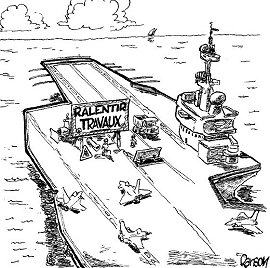 Satirical strip of Le Parisien newspaper. The sign reads : "Work in progress, slow down".