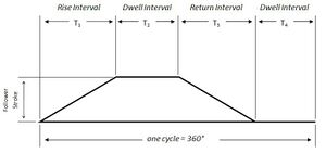 Cams can be characterized by their displacement diagrams, which reflect the changing position a follower would make as the surface of the cam moves in contact with the follower. In the example shown, the cam rotates about an axis. These diagrams relate angular position, usually in degrees, to the radial displacement experienced at that position. Displacement diagrams are traditionally presented as graphs with non-negative values. A simple displacement diagram illustrates the follower motion at a constant velocity rise followed by a similar return with a dwell in between as depicted in figure 2.[4] The rise is the motion of the follower away from the cam center, dwell is the motion where the follower is at rest, and return is the motion of the follower toward the cam center.[5]
