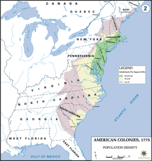 - ^ In this article, inhabitants of the thirteen colonies that supported the American Revolution are primarily referred to as "Americans", with occasional references to "Patriots", "Whigs", "Rebels" or "Revolutionaries". Colonists who supported the British in opposing the Revolution are referred to as "Loyalists" or "Tories". The geographical area of the thirteen colonies is often referred to simply as "America".