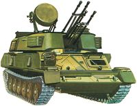 - دبابات الدفاع الجوي: إن سرعة وتيرة الأعمال القتالية وازدياد خطورة الطيران على القوات المدرعة، وخاصة في الهجوم، أدى إلى ضرورة إيجاد شبكات دفاع جوي تحمي القوات المدرعة في أثناء الحركة وتؤمن لها التغطية الجوية الفعالة. وحُلت هذه المسألة بتشكيل منظومات دفاع جوي محمولة على دبابات تستطيع مرافقة التشكيلات المدرعة وتغطيتها في مختلف أنواع الأراضي. تُسلح هذه الدبابات بمدافع ورشاشات ثقيلة مضادة للطائرات متعددة السبطانات سريعة الرمي موجهة بالرادار، أوصواريخ مضادة للطائرات مع مركبات توجيه وسيطرة وقيادة خاصة بها (الشكل 10).