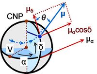 Components of proper motion on the Celestial sphere. The celestial north pole is CNP, the vernal equinox is V, the star path on the celestial sphere is indicated by arrows. The proper motion vector is μ, α = right ascension, δ = declination, θ = position angle.