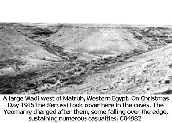 ثورة رجال القبائل المناصرون للسنوسي في ليبيا في نوفمبر 1915 شكلت تحدياً غير متوقع للجهد الحربي للحلفاء. فالقوات الإيطالية لم تكن قادرة على مد سيطرتها على مناطق السنوسيين بليبيا، التي كانت معقل الطريقة السنوسية الصوفية، ووافقت على سلام حل وسط في أبريل 1917. القوات البريطانية المتمركزة في الصحراء الغربية المصرية كانت أكثر نجاحاً. فقد لعب سلاح الهجانة مثل أولئك المصورون هنا (التابعون لكتائب 2/7 ميدلسكس والسادسة للاسكوت الملكيين) دوراً محورياً في اخضاع الثورة السنوسية هناك. IWM Q 15691 (أبريل 1916).