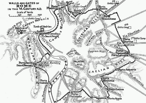 Vitiges then left a large force to keep the defenders occupied, and attacked the walls to the southeast, in the area of the Praenestine Gate, known as the Vivarium, where the fortifications were lower. A simultaneous attack was carried out in the western side, at the Mausoleum of Hadrian and the Cornelian Gate. There the fighting was particularly fierce. Eventually, after a hard fight, the Goths were driven off,[10] but the situation at the Vivarium was grave. The defenders, under Bessas and Peranius, were being hard pressed, and sent to Belisarius for help. Belisarius came, accompanied by a few of his bucellarii. As soon as the Goths breached the wall, he ordered a few soldiers to attack them before they could form up, but with the majority of his troops, he sallied forth from the gate. Taking the Goths by surprise, his men pushed them back and burned their siege engines. At the same time, whether by chance or design, the Romans at the Salarian Gate also attempted a sortie, and likewise succeeded in destroying many of the siege engines. The first attempt of the Goths to storm the city had failed, and their army withdrew to their camps.[11]