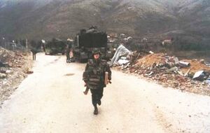 In September 1993 the ARBiH launched an operation known as Operation Neretva '93 against the HVO in order to break through to the southern Neretva valley and defeat the HVO in Herzegovina. Coordinated attacks were launched on HVO positions in the area. The focus of the attack was the HVO stronghold of Vrdi north of Mostar, but HVO managed to repel the attack. The ARBiH and HVO forces had clashes in Mostar and its Bijelo Polje and Raštani suburbs. The ARBiH made some limited gains by attacking outward from the city in three directions. The HVO responded with artillery shelling of the eastern part of the city on 23 September and an ineffective counterattack on 24 September. The use of artillery by the ARBiH and HVO further damaged the city, but neither side made significant gains. After several days of negotiations, a cease-fire was agreed on 3 October. Dozens of Croat civilians were killed in villages north of Mostar during the operation.[73][74] On 22 October, Tuđman instructed Šušak and Bobetko to continue to support Herzeg-Bosnia, believing that "the future borders of the Croatian state are being resolved there."[12]