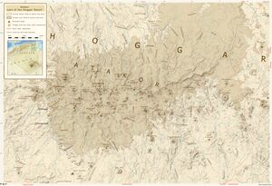 Atakor is one in a group of volcanic fields of the Hoggar around Tamanrasset which include Adrar N' Ajjer, Eg'ere, Manzaz and Tahalra,[21] and is considered to be part of the Hoggar volcanic province which since 34 million years has covered an area of 11،700 متر كيلومربع (4،500 sq mi) with 1،650 متر كيلومربع (640 sq mi) of volcanic rocks.[22] A low-seismic velocity anomaly underpins the Atakor volcanic field in the mantle[23] but does not appear to reflect the existence of a hotspot.[24]