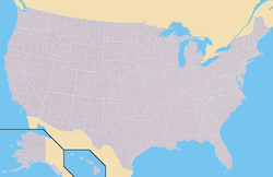 United States, showing states, divided into counties (parishes in Louisiana; boroughs in ألاسكا). Note that Alaska and هاوائي are shown at different scales, and that the Aleutian Islands and the uninhabited Northwestern Hawaiian Islands are omitted from this map.