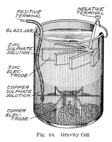 Early 20th-century engraving of a gravity cell. Note the distinctive crowfoot shape of the zinc anode.