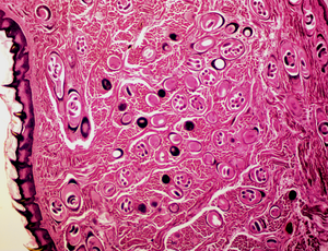 داء الشعرينات إنگليزية: Trichinosis هو داء طفيلي ينتج عن تناول لحم طائر التدرج أو الخنزير النيئ و الملوث بيرقات من نوع الشعرينة الحلزونية. During the initial infection, invasion of the intestines can result in diarrhea, abdominal pain, and vomiting.[1] Migration of larvae to muscle, which occurs about a week after being infected, can cause swelling of the face, inflammation of the whites of the eyes, fever, muscle pains, and a rash.[1] Minor infection may be without symptoms.[1] Complications may include inflammation of heart muscle, central nervous system involvement, and inflammation of the lungs.[1]