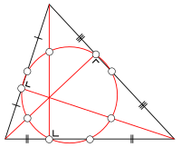 - نقطة منتصف القطعة المستقيمة الواقعة على الارتفاع الواصلة بين رأس المثلث ونقطة التقاء ارتفاعات المثلث.