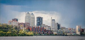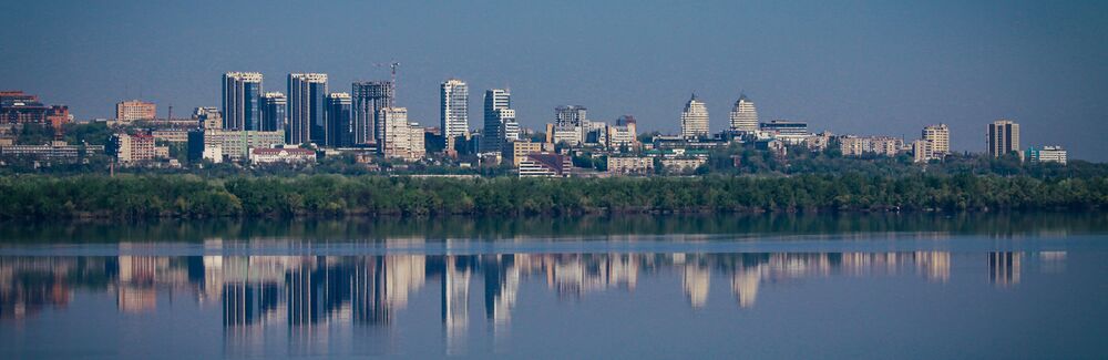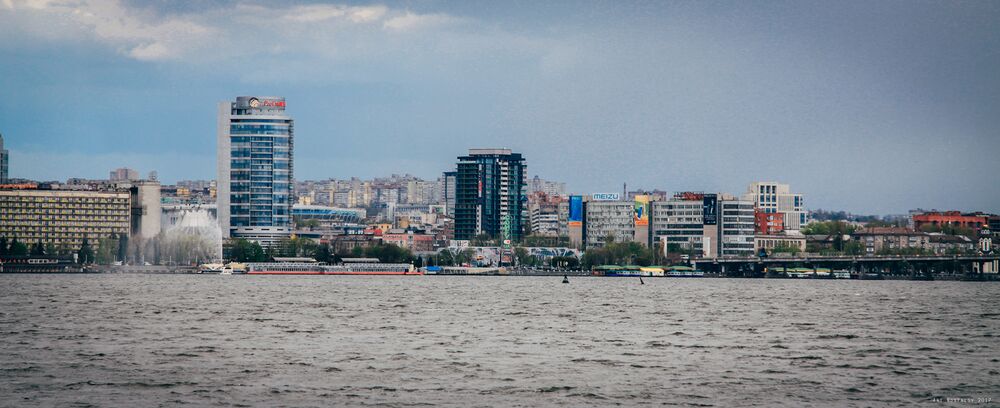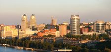 Skyline of Dnipropetrovsk with both new and old buildings seen.