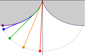 - The tip of an inextensible wire initially stretched on half arc of lower cycloid and bounded to the upper circle in P1 will then follow the point along its path without changing its length because the speed of the tip is at each moment orthogonal to the wire (no stretching or compression). The wire will be at the same time tangent in P2 to the lower arc because the tension and the demonstrated items. If it would not be tangent then there would be a discontinuity in P2 and consequently there would be unbalanced tension forces.