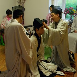 Deity or temple associations and lineage associations, pilgrimage associations and formalized prayers, rituals and expressions of virtues, are the common forms of organization of Chinese religion on the local level.[42] Neither initiation rituals nor official membership into a church organization separate from one person's native identity are mandatory in order to be involved in religious activities.[42] Contrary to institutional religions, Chinese religion does not require "conversion" for participation.[45]