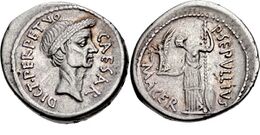 Denarius of Publius Sepullius Macer, 44 BC, with the head of Julius Caesar on the obverse. The legend mentions that Caesar was dictator perpetuo.[1] | ||||||||||||||