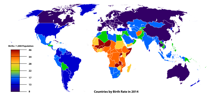 The total fertility rate of the World is estimated as 2.52 children per woman, which is above the replacement fertility rate of approximately 2.1. However, world population growth is unevenly distributed, going from .91 in Macau, to 7.68 in Niger. The United Nations estimated an annual population increase of 1.14% for the year of 2000.[5]