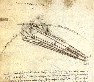 A drawing of a design for a flying machine by Leonardo da Vinci (c. 1488). This machine was an ornithopter, with flapping wings similar to a bird, first appeared in his Codex on the Flight of Birds in 1505.