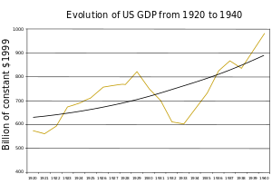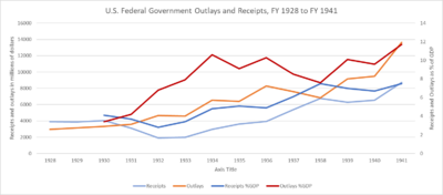 Roosevelt argued that the emergency spending programs for relief were temporary, and he rejected the deficit spending proposed by economists such as John Maynard Keynes.[119] He kept his campaign promise to cut the regular federal budget — including a reduction in military spending from $752 million in 1932 to $531 million in 1934. He made a 40% cut in spending on veterans' benefits by removing 500,000 veterans and widows from the pension rolls and reducing benefits for the remainder, as well as cutting the salaries of federal employees and reducing spending on research and education. The veterans were well organized and strongly protested, and most benefits were restored or increased by 1934.[120] In June 1933, Roosevelt restored $50 million in pension payments, and Congress added another $46 million more.[121] Veterans groups such as the American Legion and the Veterans of Foreign Wars also won their campaign to transform their benefits from payments due in 1945 to immediate cash when Congress overrode the president's veto and passed the Bonus Act in January 1936.[122][123][صفحة مطلوبة] The Bonus Act pumped sums equal to 2% of the GDP into the consumer economy and had a major stimulus effect.[124] Government spending increased from 8.0% of gross national product (GNP) under Hoover in 1932 to 10.2% of the GNP in 1936.[125]