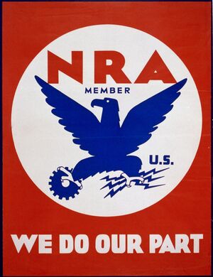 Roosevelt appointed Hugh S. Johnson as the head of the NRA, based on his experience in directing the national economy in World War I. Johnson used the NRA to curb industrial overproduction and excessive competition through price cutting. He sought to keep wages high.[59] The NRA won the pledges of two million businesses to create and follow NRA codes, and Blue Eagle symbols, which indicated that a company cooperated with the NRA, became ubiquitous.[60] The NRA targeted ten essential industries deemed crucial to an economic recovery, starting with textile industry and next turning to coal, oil, steel, automobiles, and lumber. Though unwilling to dictate the codes to industries, the administration pressured companies to agree to the codes and urged consumers to purchase products from companies in compliance with the codes.[58] As each NRA code was unique to a specific industry, NRA negotiators held a great deal of sway in setting the details of the codes, and many of the codes favored managers over workers.[61] The NRA became increasingly unpopular among the general public due to its micromanagement, and many within the administration began to view it as ineffective.[62] The Supreme Court found the NRA to be unconstitutional by unanimous decision in May 1935, and there was little public protest at its closing.[63]
