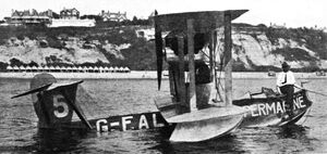 On joining the company, Mitchell was given the opportunity to develop skills in a number of roles, so as to gain experience of the aircraft industry.[6] His basic engineering training would have helped him to become established, as he adjusted from working with locomotives to understanding aeroplanes.[8] A competent mathematician, Mitchell's ability to think creatively and use his intuition when looking at a design was soon recognised.[9] The earliest record of his work at Supermarine is as a draughtsman, and dates from 1916.[6] By 1917, he had become assistant to the company's owner and designer, Hubert Scott-Paine.[3] He is likely to have played a role in the development of the Baby when in 1919 it was adapted for racing for the Schneider Trophy, and was renamed the Supermarine Sea Lion.[10]