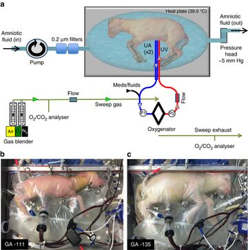 1. ^ أ ب Partridge, Emily A.; Davey, Marcus G.; Hornick, Matthew A.; McGovern, Patrick E.; Mejaddam, Ali Y.; Vrecenak, Jesse D.; Mesas-Burgos, Carmen; Olive, Aliza; Caskey, Robert C.; Weiland, Theodore R.; Han, Jiancheng; Schupper, Alexander J.; Connelly, James T.; Dysart, Kevin C.; Rychik, Jack; Hedrick, Holly L.; Peranteau, William H.; Flake, Alan W. (25 April 2017). "An extra-uterine system to physiologically support the extreme premature lamb". Nature Communications. 8: 15112. Bibcode:2017NatCo...815112P. doi:10.1038/ncomms15112. PMC 5414058. PMID 28440792. CC-BY icon.svg Text was copied from this source, which is available under a Creative Commons Attribution 4.0 International License.