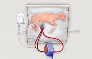 شكل من ورقة بحثية نشرتها ناشتر كومنيكيشن عام 2017، تصف نظام دعم الحياة خارج الرحم ، أو "biobag"، المستخدم لإناء أجنة الحملان.[1]