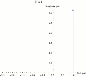 الدالة الأسية ez يمكن تعريفها بأنها نهاية (1 + z/N)N, باقتراب N من مالانهاية، وبذلك فإن eiπ هي نهاية (1 + iπ/N)N. وفي هذا التحريك، فإن N تأخذ قيم مختلفة متزايدة من 1 إلى 100. حساب (1 + iπ/N)N يُعرض كتأثير مجمَّع لعمليات ضرب مكررة N مرة في complex plane، وتكون النقطة النهائية هي القيمة الفعلية لـ (1 + iπ/N)N. يمكن رؤية أنه كلما أصبحت N أكبر، فإن (1 + iπ/N)N تقترب من النهاية −1. ولذلك، eiπ = −1, تُعرف بإسم هوية اويلر.