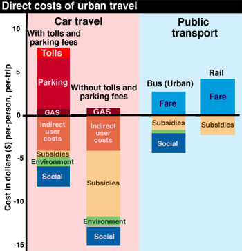 The cost of motor vehicle parking plays a major role in transportation choices (US, 1999 dollars). The value above the line represents the out-of-pocket cost per trip for each mode of transportation, while the value below the line accounts for subsidies, environmental impact, social and indirect costs.[1]