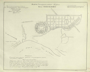 In 1770 the fortress of Aleksandrovskaya (Александровская) was erected and is considered to be the year of the foundation of Zaporizhzhia. As a part of the Dnieper Defence Line the fortress protected the southern territories of Russian Empire from Crimean Tatar invasions.[6] It is uncertain in whose honour the fortress was named. Some believe that it was Aleksander Golitsyn, the general who served Catherine the Great.[4] Other possibilities are Prince Aleksandr Vyazemskiy[6][7] or Alexander Rumyantsev.[8] In 1775, Russia and the Ottoman Empire signed the Küçük Kaynarca peace treaty, according to which the southern lands of the Russian Plain and Crimean peninsula became Russian-governed territories. As a result, the Aleksandrovskaya Fortress lost its military significance and converted into a small provincial rural town, known from 1806 under the name Alexandrovsk (Александровск).[4]