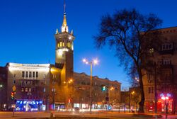 The ring house the building No. 31 at Independent Ukraine Street (formerly – 40 years of Soviet Ukraine Street) was designed by V.G. Lavrov. Families of the Soviet and American engineers, advisors, and industry bosses lived in Sotsgorod at that time. However, the most of the workers during the construction of the hydro-power station and plants lived in dugouts at No. 15 and Aluminum districts.[بحاجة لمصدر] The south border of the Sotsgorog is limited by Verkhnya Ulitsa (Upper Street) and north border – by the hydroelectric power station. At the intersection between Sobornyi Avenue and Verkhnya Street, architect I.L. Kosliner set a tower with seven stories. This tower supposedly indicates the entrance gate of Sotsgorod from the south (from Alexandrovsk). Closer to the dam, the second tower was raised (architects I.L. Kosliner and L.Ya. Gershovich). Both towers point out a straight line of the central street of the district.
