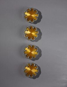 Buttons can be individually crafted by artisans, craftspeople or artists from raw materials or found objects (for example fossils), or a combination of both. Alternatively, they can be the product of low-tech cottage industry or be mass-produced in high-tech factories. Buttons made by artists are art objects, known to button collectors as "studio buttons" (or simply "studios", from studio craft).[13]
