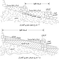 ب - مدرجات مستوية طويلة: طولها غير محدد ولكن يستحسن بهدف تقليل المخاطر تقسيمها بقواطع ترابية على مسافات 3 - 4م، وتُغلق نهاية كل منها أو تفتح إلى مجار طبيعية ذات فتحات مغطاة بغطاء نباتي كثيف يمنع الانجراف.