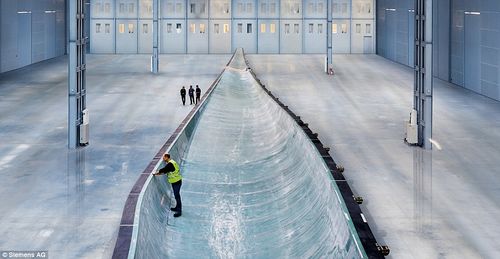 على مدى العقود القليلة الماضية، قيل لنا طاقة الرياح ستكون واسعة النطاق. الآن عملاق التصنيع سيمنز تتخذ هذا حرفيا، من خلال بناء أكبر توربينات في العالم - حيث كل شفرة ذات قياس مذهل 75 مترا في الطول. وهذا يعني أن كل واحدة منهم ليست سوى جزء أقصر قليلا من طائرة لنقل المسافرين أكبر من أي وقت مضى - لطائرة ايرباص A380 ، مع جناحيها قياس 79.8 مترا.