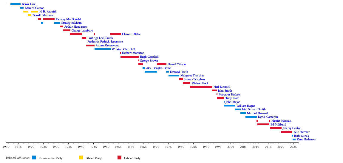 The leaders of the two Houses were of equal status, before 1911, unless one was the most recent Prime Minister for the party. Such a former prime minister was considered to be the overall leader of the opposition. From 1911 the Leader of the Opposition in the House of Commons was considered to be the overall Leader of the Opposition. Overall leaders names are bolded. Acting leaders names are in italics unless the acting leader subsequently became a full leader during a continuous period as leader.