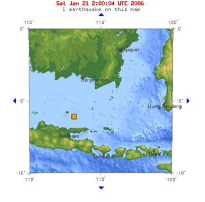 يوم الجمعة، 20 يناير 2006 ضرب زلزال معتدل منطقة جاوة، أندونيسيا، و ذلك بتوقيت 20:26:51 (UTC). بقوة مقدارها 5.0 على مقياس ريختر، و بعمق قدر بحوالي 575 كيلومترَ (357 ميل).