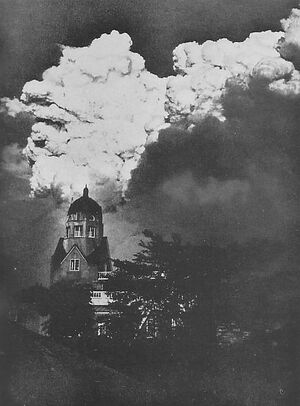 At 11.55 a.m. ship commenced to tremble and vibrate violently and on looking towards the shore it was seen that a terrible earthquake was taking place, buildings were collapsing in all directions and in a few minutes nothing could be seen for clouds of dust. When these cleared away fire could be seen starting in many directions and in half an hour the whole city was in flames.[20]