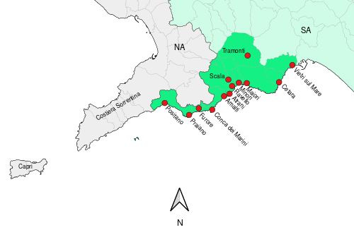 | Amalfi | Lone, Pastena, Pogerola, Tovere, Vettica Minore | Amalfi Cathedral, and its cloister (إيطالية: Chiostro del Paradiso) |